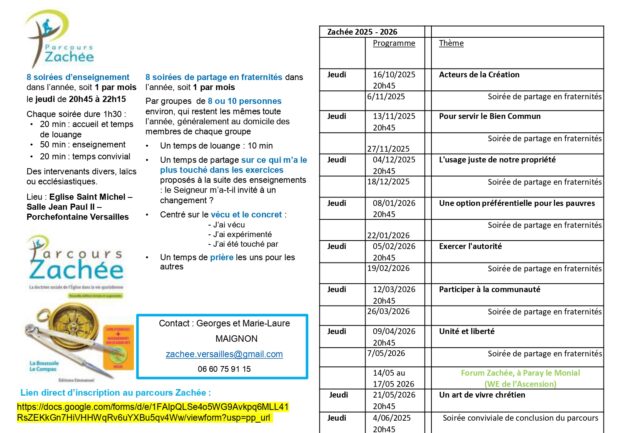 Parcours Zachée : Comment réconcilier vie personnelle, familiale, professionnelle et spirituelle ? Comment agir en chrétien et en vérité dans un quotidien déchristianisé ? Comment unifier notre identité d’enfant de Dieu et nos…