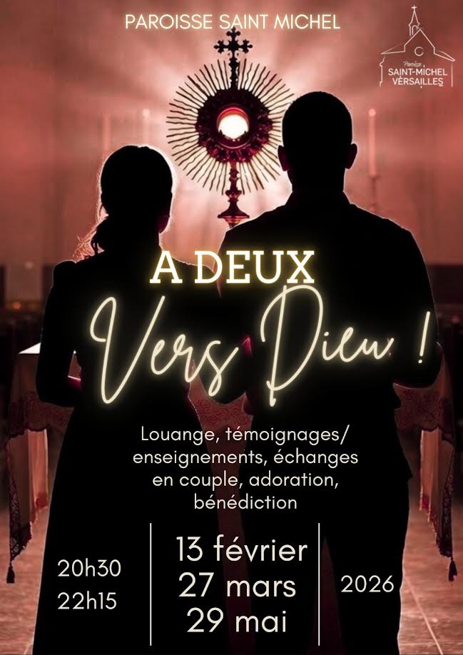 Jan262026Paroisse Viser la sainteté en couple ! Catégorie ParoissePar secretariat26 janvier 2026 Auteur secretariat Navigation de commentaireOnglet précédent Onglet précédent Conférence sur Saint Michel – Mardi 10 février 2OH30Onglet suivantOnglet suivantUne heure de paix : prière de TaizéRelated PostsUne heure de paix : prière de Taizé26 janvier 2026Conférence sur Saint Michel – Mardi 10 février 2OH3016 décembre 2025Pèlerinage à Cotignac des mères et pères de famille – 8, 9, 10 mai et 3, 4, 5 juillet 20267 novembre 2025Parcours Zachée4 septembre 2025Un marché solidaire à la paroisse Saint Michel12 mai 2025JUBILÉ 2025 à Saint Michel24 janvier 2025